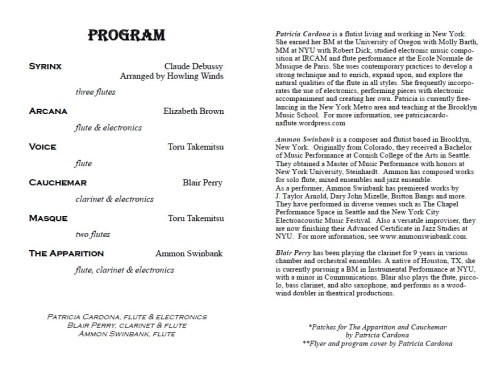 Hello everyone! It is late summer, things are really getting hot and humid (in New York City at least), and it’s time to catch up on what has been happening during the sunny months. On June 13th I had the wonderful experience of performing at the New York City Electroacoustic Music Festival (NYCEMF), directed by Hubert Howe. Thank you for thinking of me Hubert! I played Anamnese for flute and electronics by Hiromi Watanabe. The video recording of the performance at Abrons Arts Center is posted below.